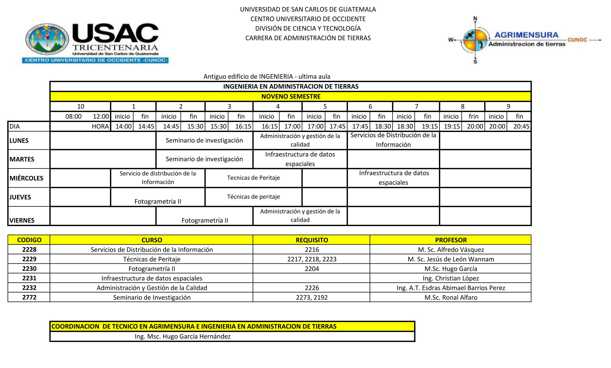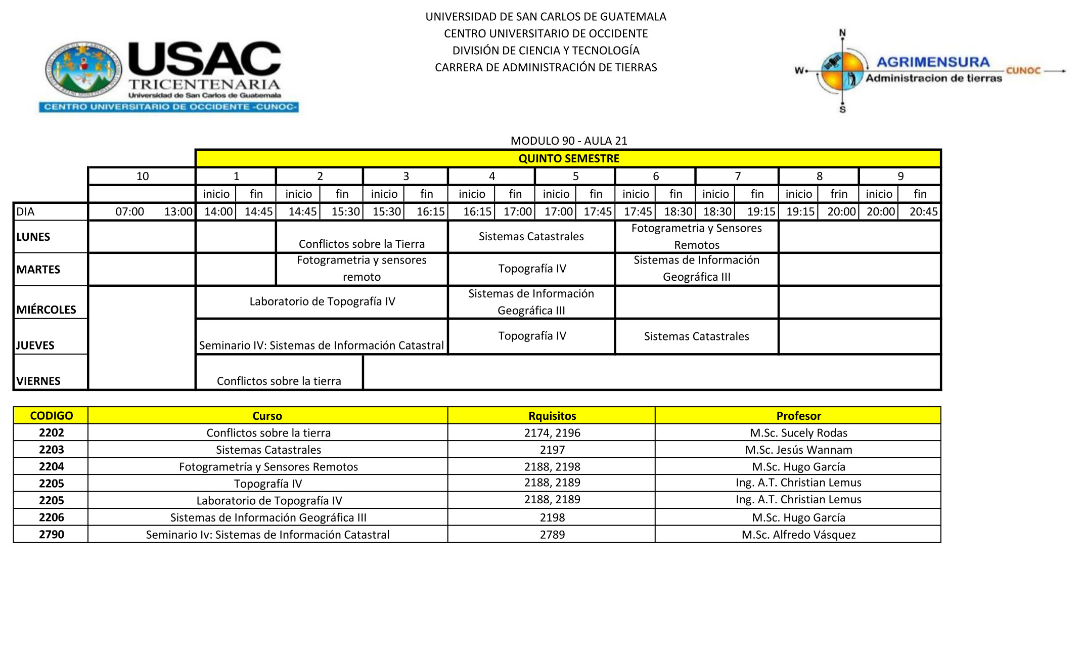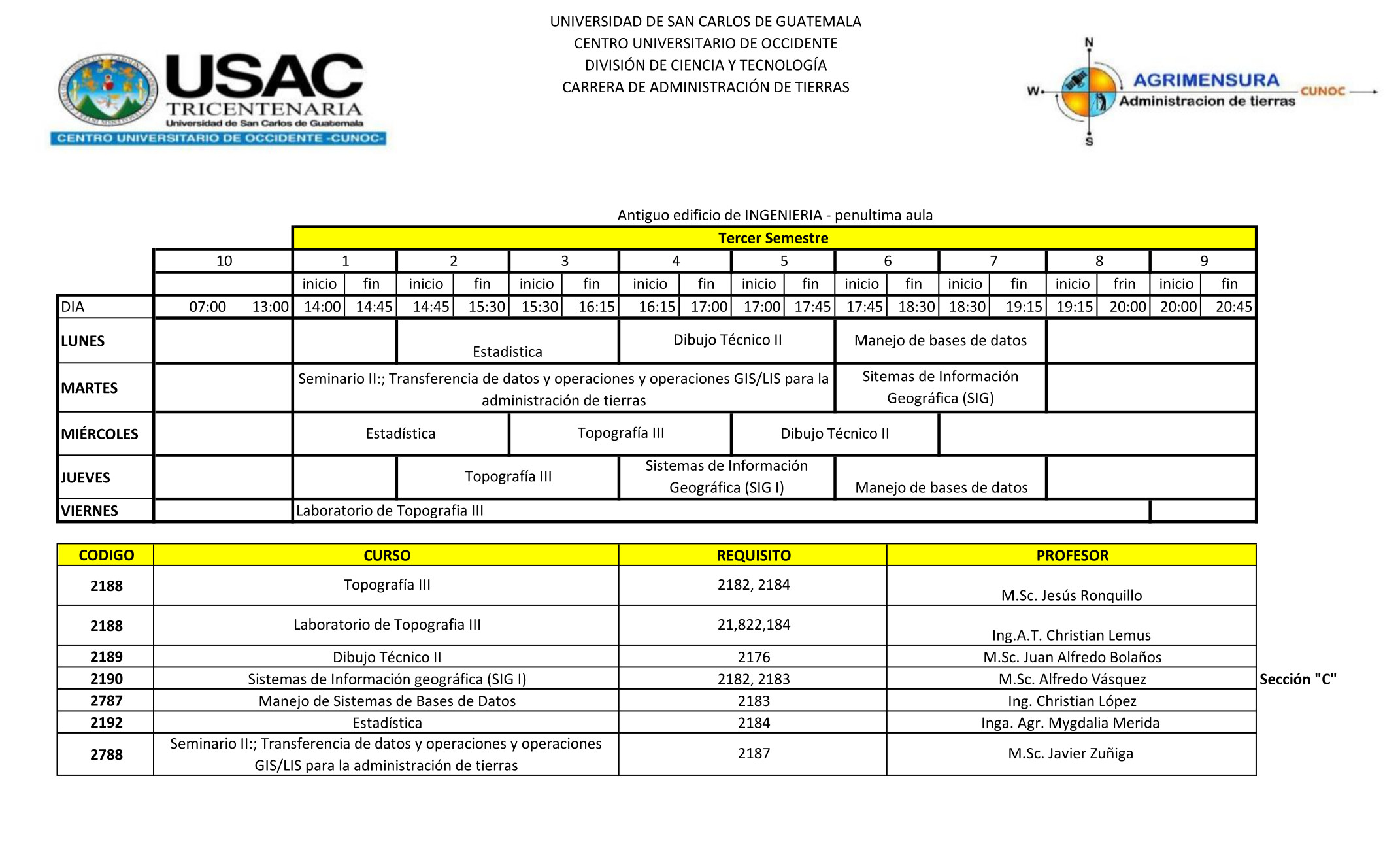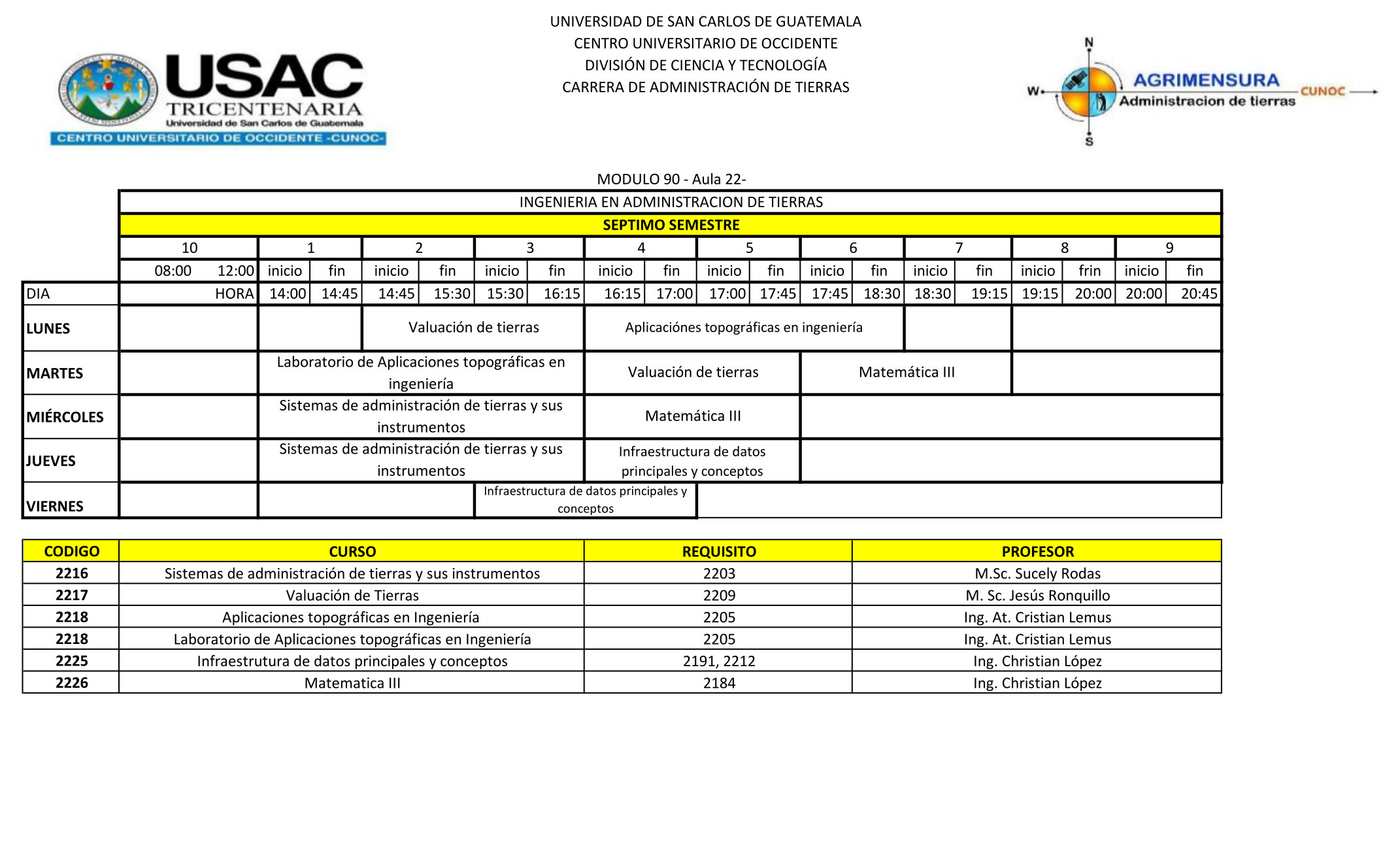 Se pone a disposición el horario de Primer Semestre 2026 para las Carreras del Técnico en Agrimensura y la Ingeniería en Administración de Tierras